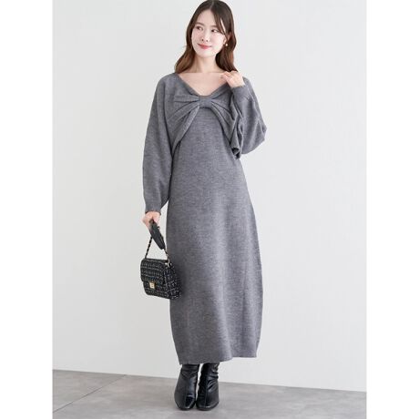 [型番:25550718322]リボンモチーフのトップスとキャミワンピースのセットアイテム。温かみのあるニット素材を使用しており、シーズンらしい着こなしを楽しめます。裾に向かってなだらかに広がるシルエットがポイント。休日のお出かけコーデに大活躍してくれるアイテムです。モデル(サックス着用)身長:165cmMサイズ着用モデル(濃グレー/黒/ベージュ着用)身長:160cmMサイズ着用