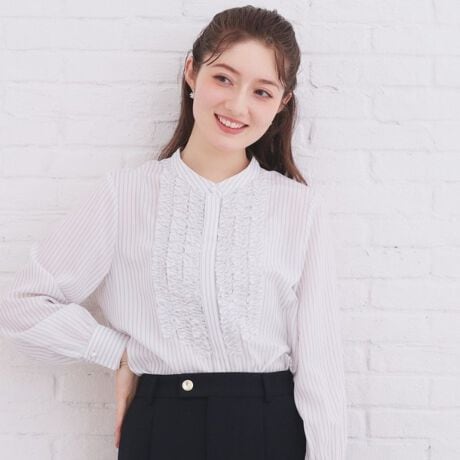 ・バンドカラー×フリルデザインの絶妙な組み合わせで、清潔感と華やかさを両立した品のある一着。顔まわりをすっきりと見せつつ、フリルの柔らかな表情が女性らしさを引き立てます。