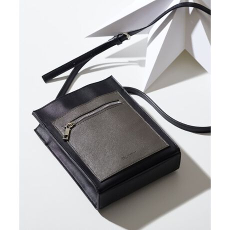 ポイントで合成皮革のポケットをあしらったコンビデザインのショルダーバッグ。