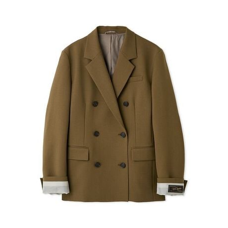 袖口のターンバックがデザインポイントになっている、ダブルブレストのジャケットです。
