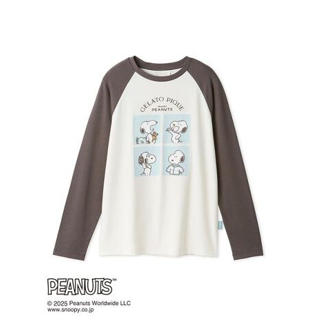 PEANUTSとgelato piqueのコラボレーションシリーズから、ファミリーでお楽しみいただける新作が登場。PEANUTSの仲間たちが、おやすみ前の幸せなひとときを過ごす様子をgelato piqueだけの特別なオリジナルアートで表現したラグランスリーブのロンTです。鏡や窓をイメージした四角い枠に、今夜のルームウェアを選んでいるスヌーピーや、gelato pique定番のボーダーパーカを着用して遊んでいるペパーミント パティなどをデザイン。おうちの屋根のようなアーチロゴを効かせました。色は優しい雰囲気のアイボリーと、袖の色でスヌーピーの耳をイメージしたチャコールグレーをご用意。同シリーズの総柄ロングパンツやストライプネルロングパンツと合わせたり、メンズサイズとのペアコーディネートもおすすめです。