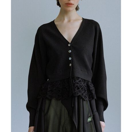 バレンレースを裾にドッキングさせたVネックカーディガン。