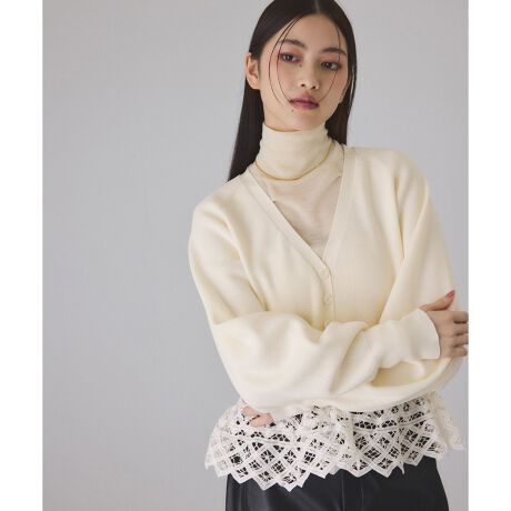 バレンレースを裾にドッキングさせたVネックカーディガン。