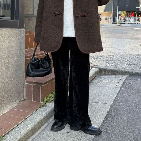 *この製品は、生地の特性上引っかかると糸が飛び出しやすい傾向があります。着用時にはベルトやバック、周囲の壁など表面の粗いものとの摩擦や引っかかりにご注意ください。