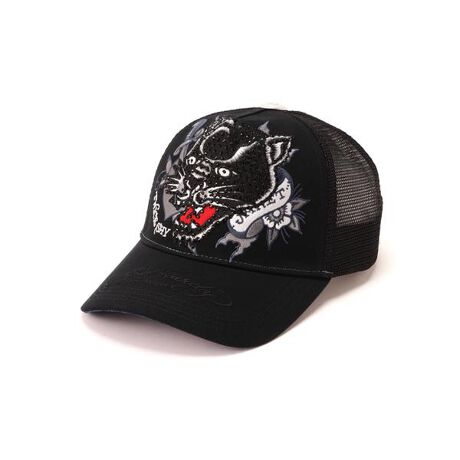 黒のボディに、力強いブラックレオパード(黒ヒョウ)のタトゥーアートワークをフィーチャーした、ワイルドでクールなEd Hardyのメッシュキャップです。