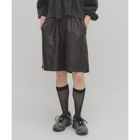 ハードなフェイクレザー素材を使用したショートパンツ。ウエストはオールゴム仕様、太もも周りはゆったりとしており、リラクシーな穿き心地が叶います。程よい光沢感が上品さを出しつつ、異素材MIXスタイルにもぴったりなアイテムです。