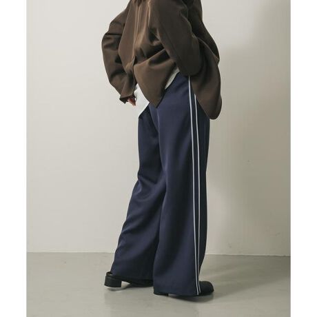 伸縮性のある柔らかな素材を使用したラインパンツ。サイドに入った配色ラインが、スポーティながらも洗練された印象を与え、コーディネートのおしゃれなポイントになります。ゆったりとしたルーズシルエットなので、身体のラインを拾いにくく、楽にトレンド感のある着こなしが叶います。