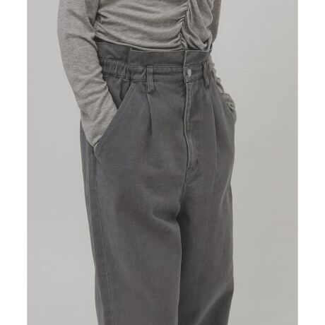 ウエストのフリルデザインが最大の魅力の、カジュアルコーデにぴったりなツイルパンツ。さりげなく入ったフロントタックと、裾に向かって少しすっきりとしたシルエットもポイントです。ウエストのデザインが活きるよう、トップスをタックインした着こなしやコンパクトなトップス合わせがおすすめです。