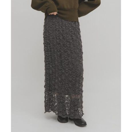 ポコポコした透かし編みがポイントのニットスカート。スラブ糸で立体感のある編地が冬らしく、ペチコート付きなので1枚着のみならずレイヤードスタイルにも最適です。様々なスタイリングが楽しめる1着に仕上げました。