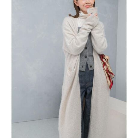 FOX混でふんわりした毛足感と女性らしい糸を使用し、贅沢な風合いに仕上げています。ゆったりとしたガウン型シルエットで女性らしい雰囲気を演出。見頃には裏地付きで、インナーを選ばず滑りの良い着心地も嬉しいポイント。防寒性もあり、アウター代わりとしても長く活躍するアイテムです。長めの袖は折り返してサムホール仕様にすると、ルーズな着こなしも楽しめます。ニットパンツと合わせて、女性らしいリラクシースタイルもおすすめです。
