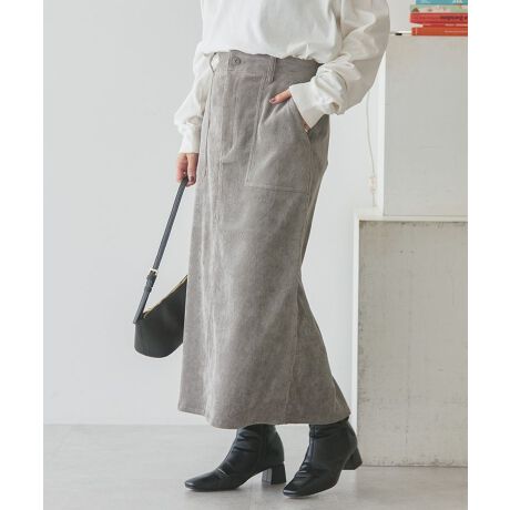スタイリングしやすいロング丈でオン・オフ問わず合わせていただけるデザインタイトスカート。シーズナルな雰囲気を演出するコーデュロイ生地を使用した、トップスを選ばない汎用性の高さが魅力です。ウエストはバックゴム仕様で楽に着脱出来、アレンジも可能なベルトループ付き。サイドに大きめのベイカーポケットを加えた旬テイストなディテールもポイントです。透け感[なし]