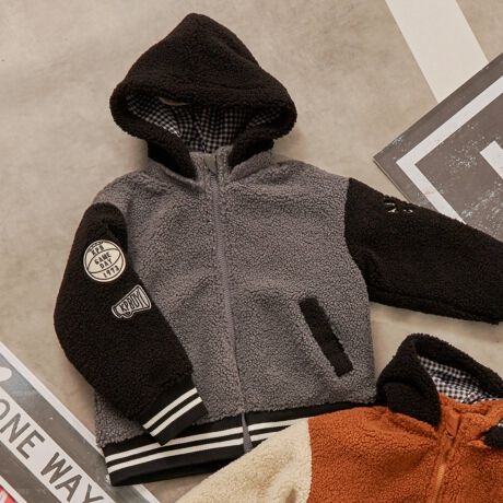 袖とフードの配色切り替えが目を引くシープボア素材のジャケット。