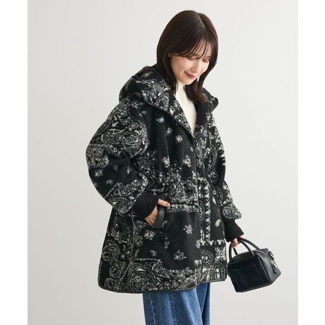 ボリュームのあるボア生地がシーズナルなデザインコート。品のあるペイズリー柄のモノトーンなカラーリングが目を惹くおしゃれな一着です。ジップファスナーでアレンジ可能なフードやフェイクレザーをパーツ使いしたこだわりのディテールにも注目。袖口リブ仕様でしっかりと防寒性もあり、カジュアルに合わせていただけるおすすめのアイテムです。