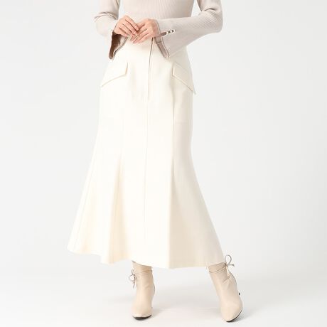 クラシカルな雰囲気漂うフロントジップマーメイドスカート。ウエストまわりのディテールがアクセントとなり、裾に向かって広がるシルエットが女性らしさを演出します。ニットで大人カジュアルに、ブラウスでフェミニンに着こなせる万能アイテムです。