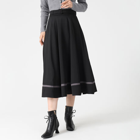 程よいハリ感のある裾配色フレアスカート。動くたびに揺れるシルエットが女性らしい印象を与え、裾の配色ラインが上品なアクセントに。ニットで大人カジュアルに、ブラウスでフェミニンに着こなせる万能アイテムです。