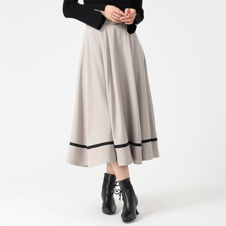 程よいハリ感のある裾配色フレアスカート。動くたびに揺れるシルエットが女性らしい印象を与え、裾の配色ラインが上品なアクセントに。ニットで大人カジュアルに、ブラウスでフェミニンに着こなせる万能アイテムです。