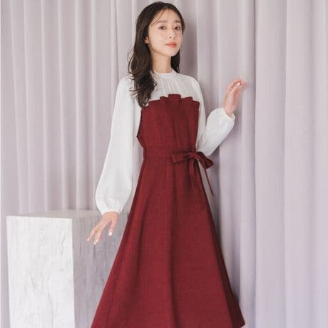 ツイードビスチェを重ねたようなドッキングデザインが上品なワンピース。