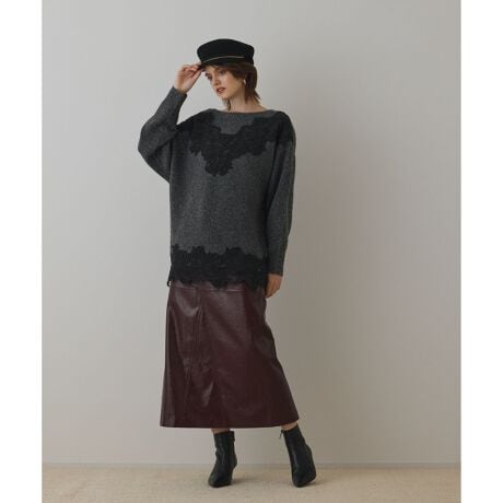 コーディネートを品よく華やかに演出してくれるニットトップス。裾と、肩から胸元にかけて大胆ながらも繊細なレースを施した、リュクスな表情のデザインです。ゆったりとしたリラックスシルエットに、デコルテが綺麗に見えるやや横に広い衿ぐりで、女性らしいニュアンスを感じられる一枚に仕上げました。主役としての存在感を放ちつつモノトーンで纏める事で、華美過ぎない大人な表情に。定番兼主役としてワードローブに加えたくなるアイテムです。