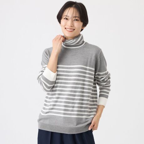 バイカラーで変化をつけ2枚仕立てにしたタートルネックがポイントのニットプルオーバー。袖口も衿に合わせた配色でアクセントにしています。身頃は程よくゆとりのあるシルエットでバランスよく仕上げました。色によって、無地とボーダーで展開します。