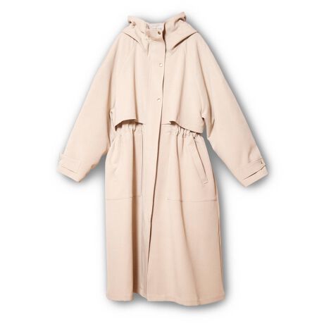 オーバーサイズながら、ラグランスリーブやギャザー使いが女性らしく、余分な装飾はそぎ落としたクリーンなムードのコート。