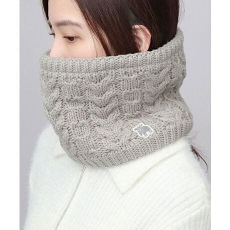 全体にケーブルニット生地を使用した、見た目にも暖かみのある表情のネックウォーマー。エルク(ヘラジカ)の刺繍ワッペンがワンポイントに。