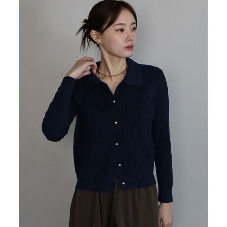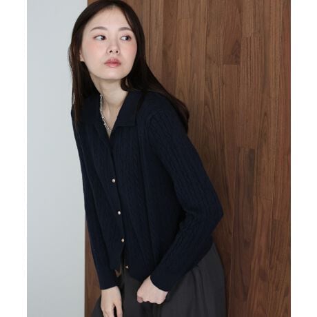 立体感のあるケーブル編みと、上品に輝く金ボタンが目を惹くニットカーディガン。