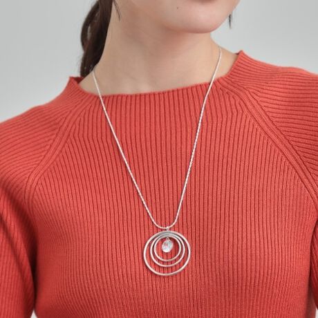 3連のオープンリングモチーフの中央に存在感のあるダイヤ風キラキラモチーフがゆれるネックレス。