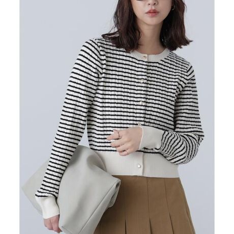※1315270207【金ボタンミニケーブルカーディガン】と同型商品でございます。プレッピーな雰囲気のミニケーブルカーディガン。程よいコンパクトなシルエットで、目の詰まったミニケーブル×リブの編地で凸凹があり、体のラインを拾わずスッキリと着こなせます。小ぶりでマットなゴールドカラーのボタンがポイント。シャツカラーやフリルネックブラウスとのレイヤード見せや、フロントのボタンを全て留めて、プルオーバーのようにも着られます。デニムやミニ丈のボトムスとのコーディネートがおすすめです。※モデルの着用画像の場合、光の当たり具合により、実際の色味と異なって見えることがございます。色味は、商品単体の画像をご参照ください。