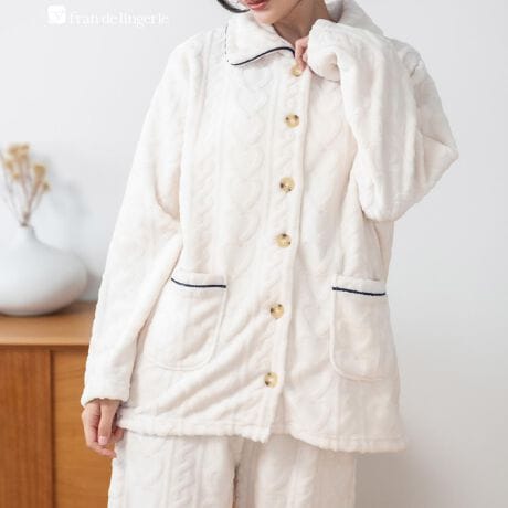 軽くて暖かい、ふんわりフリースはリラックスタイムの防寒にぴったり。カラーやデザインが豊富なフランデランジェリーの人気の冬のあったかパジャマmemory fleece (メモリーフリース)シリーズです。
