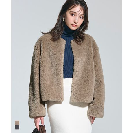 シンプルで上品なノーカラーデザインのフェイクファーブルゾン