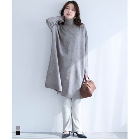 シンプルながら女性らしい印象を引き立てるタートルニットワンピース。