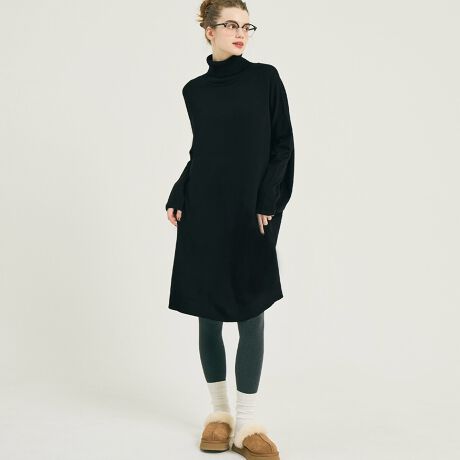 シンプルながら女性らしい印象を引き立てるタートルニットワンピース。