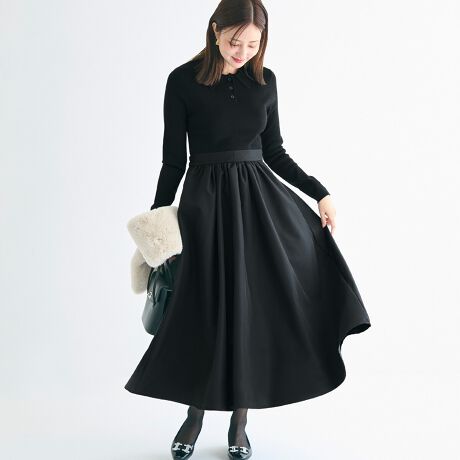 ・トップスとスカート部分で異なる素材感をドッキング