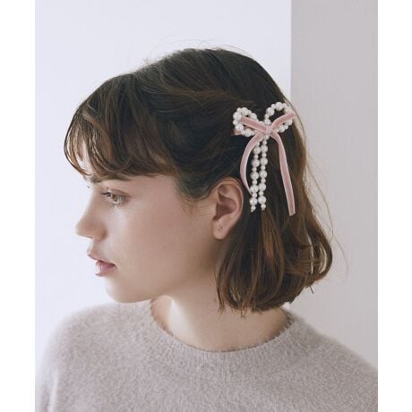 サイズ違いのパールビーズをMIXしたリボンモチーフが大人可愛いヘアクリップ。