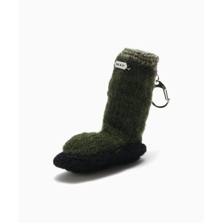 ニットの手編みで作られた、立体的な長靴の形が目を惹くグリーンブーツのキーホルダー。