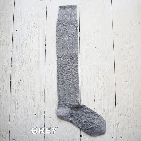 繊細なメッシュの編み柄のロング丈のハイソックスです。