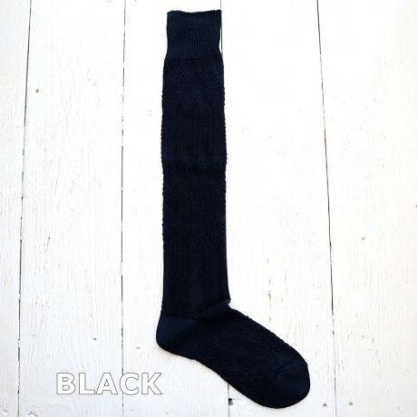 繊細なメッシュの編み柄のロング丈のハイソックスです。