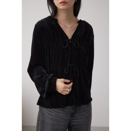 ■ベロアリボンブラウス■ポイント上品な光沢とドレープ感が魅力の、ベロアリボンブラウス。今期一押し素材のベロアアイテムです。 ■ディテールベロア特有の柔らかな光沢で、シーズンムードを高める一着。胸元にはリボンを施し、女性らしいアクセントに。切替デザインでギャザーをたっぷりと入れ、立体感と動きのあるシルエットを実現。前後差のある裾ラインが抜け感を演出し、パンツともスカートとも好相性。袖口は幅広カフス仕様で、モードな印象をプラス。■スタイリング細身のパンツと合わせればトップスを主役にした大人のスタイリングに。ロングスカートを合わせればドレッシーな雰囲気で、ディナーや特別なお出かけにも最適。デニムでカジュアルに着こなすのがAZULらしくて◎。■生地秋冬らしいベロアの表情とほどよい透け感の軽やかな素材感が特徴です。透け感:あり裏 地:なし伸縮性:あり光沢感:あり[注意事項]※画像の商品はサンプルです。実際の商品と仕様、加工が若干異なる場合があります。※画像の商品は光の照射や角度、お使いのモニター環境により、実物と色味が異なる場合がございます。※着用、お取り扱いの際は、アテンションタグをご確認ください。