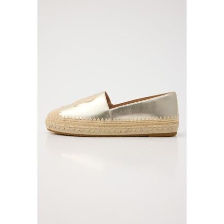 [型番:350IS149-9060]トレンドライクなシャイニーレザーに、立体的なロゴモチーフがアクセントきいた涼し気なエスパドリーユ。刺繍部分にもこだわりの詰まった、大人カジュアルにマストなデイリーにも履きやすい、オリジナリティ溢れる1足です。