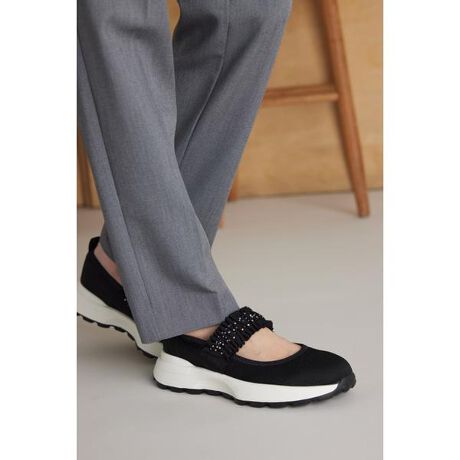 [型番:350HA149-9555]オールシーズン履ける、NEWソールスリッポン。素足でもソックス合わせにも◎な抜け感あるメリージェーンデザインには、ギャザーベルトにストーンをあしらったキュートさ溢れる1足です。