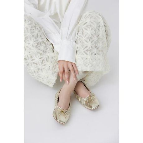 [型番:350IS112-2090]細かなディテールにこだわったスクエアバレリーナシューズ。リボンの結び目にはユニークな蛇モチーフのジュエリーを装飾。ソフトなシープレザーに、履き口は脚にフィットするシャーリング、ぷっくりとした吸い付くようなインソールに屈曲性も抜群です。