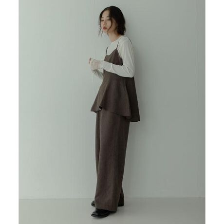 秋冬ムードが高まるヘリンボーン素材を使用したキャミトップスとパンツのセットアップ。