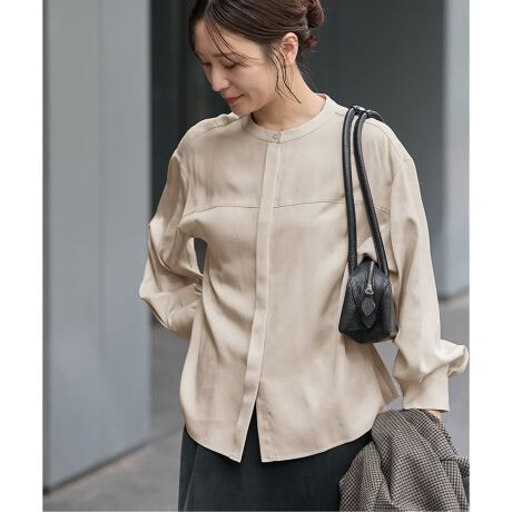 落ち感のある素材感で、キレイ目な印象のノーカラーブラウス。