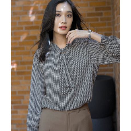 ・知的で華やかな印象に仕上がるボウタイブラウス・長すぎない着丈でウエストインしてももたつきにくく、きれいめにお使いいただけるデザイン・裏地が付いているのでインナーが透けにくい・千鳥(305)はバイカラーデザインで、1枚でも着映えします