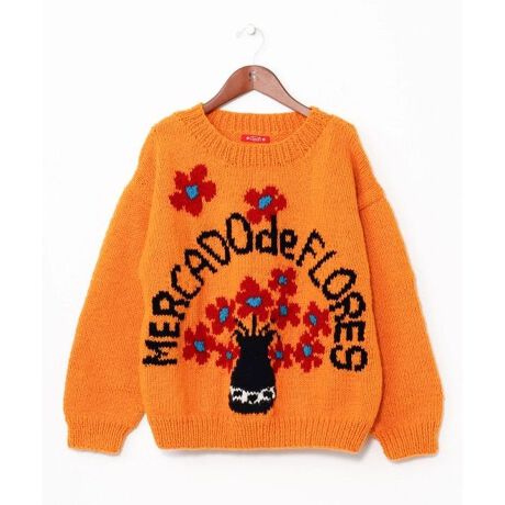 [型番:NSR-5302-2025]ふっくらボリュームのある、ネパールの職人さんによる手編みのニット。編みこまれている文字「mercado de flores」はフラワーマーケットという意味。大胆に編まれた花の柄が目を引く一枚。
