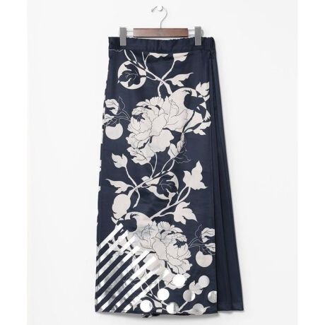 [型番:7CC-5309-2025]牡丹と幾何学模様を大胆にデザインした袴風パンツ。箔プリントが施されており、華やかな印象に。巻きスカートのようなシルエットの間から、プリーツ加工されたパンツが覗くデザインがかっこよく、和のエッセンスを取り入れたモダンなスタイルを楽しめる一枚です。