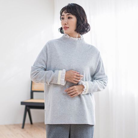 今シーズンは、表情感をあたえつつスッキリとしたバイアス組織にし、ニットらしいあたたかみを感じる印象に仕上げています。