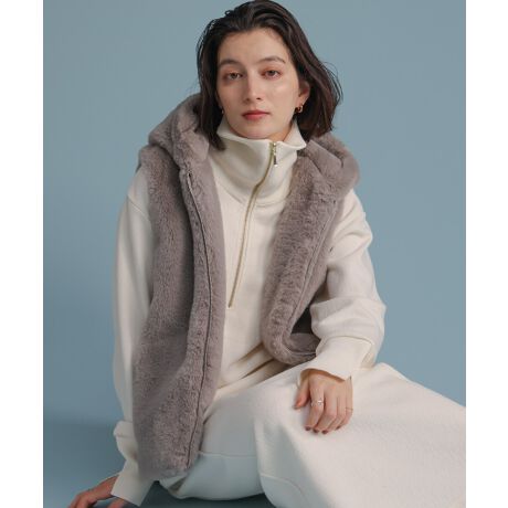 ふんわりと包み込まれるような優しい着心地が魅力の、フェイクシープファーベスト。短めの毛足でボリュームが出すぎず、上品にまとまるのがポイントです。フード付きのデザインで、ほどよくカジュアルな抜け感をプラス。すっきりとしたシルエットなので、ニットやワンピースの上から重ねてもバランスよく決まります。短丈で脚長効果もあり、スカートにもパンツにも好相性。暖かいのに軽くて動きやすい、そしてエレガント!まさに“大人の理想”が詰まった一枚です。
