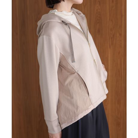 パウンドケーキの様に軽く柔らかい素材を使用 柔らかくもっちりとした肌触りで、着心地抜群!カットソーなのにキレイ目なスタイリングにもマッチします。 サイドの布帛使いがシルエットの立体感を演出。大人カジュアルな印象に 裾は絞って着丈を程良く短くすることでスカートにも合わせやすい!今年はプルオーバーとして閉めてアウターにINしたレイヤードコーデがオススメ!その際は逆開ファスナーを裾側少し開いて着るとこなれた印象に。細部の金属使いもポイント!
