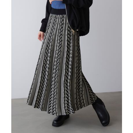 立体感のある編地が印象的なニットスカート。ロング丈で女性らしい上品さと、裾に向かって広がるフレアシルエットで、デイリーにもお出かけにも活躍。ウエストは総ゴムになっているので、そのままスポッと楽に穿いていただけます。